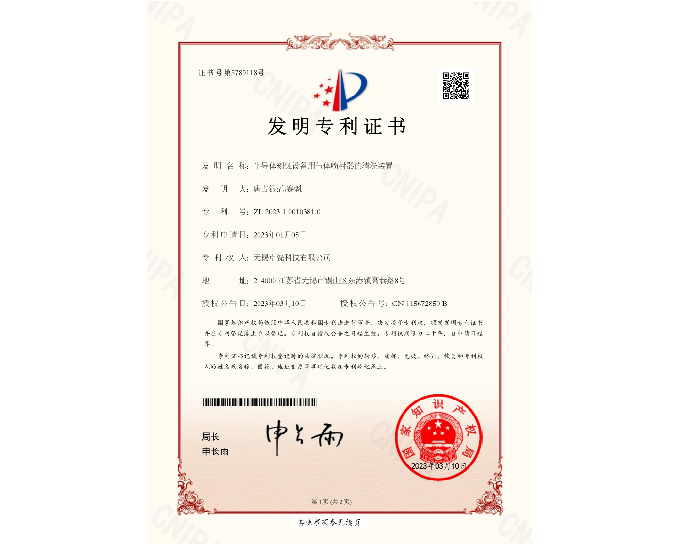 ZL-2023100103810—半导体刻蚀设备用气体喷射器的清洗装置 发明专利证书 -