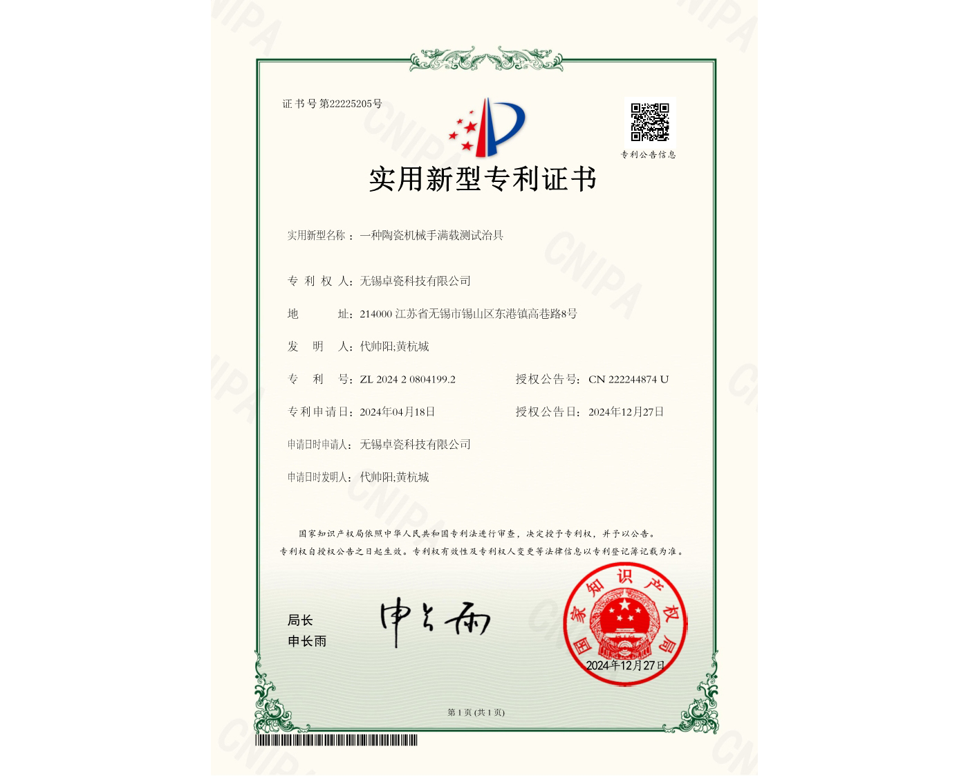 一种陶瓷机械手满载测试治具 实用新型专利证书 -