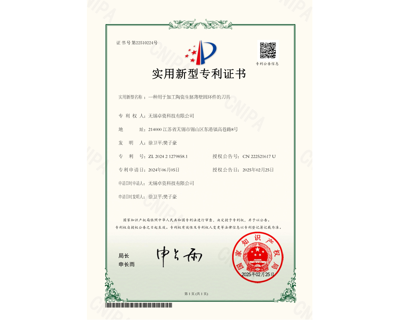 ZL2024212798581 一种用于加工陶瓷生胚薄壁圆环件的刀具 实用新型专利证书 -