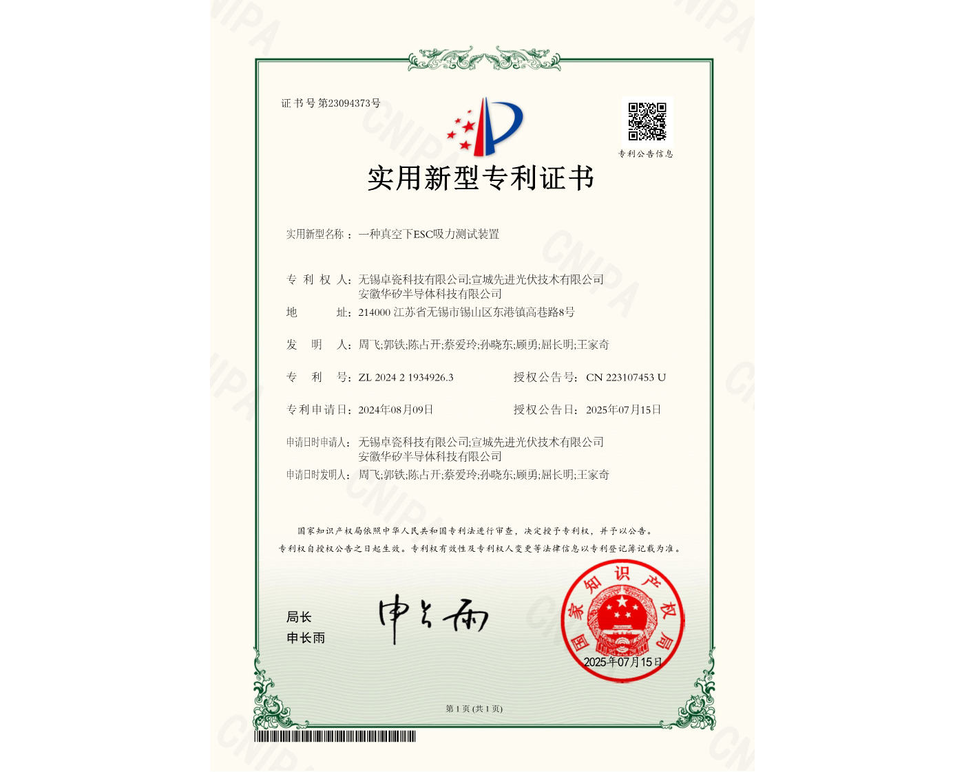 ZL2024219349263一种真空下ESC吸力测试装置 实用新型专利证书 -
